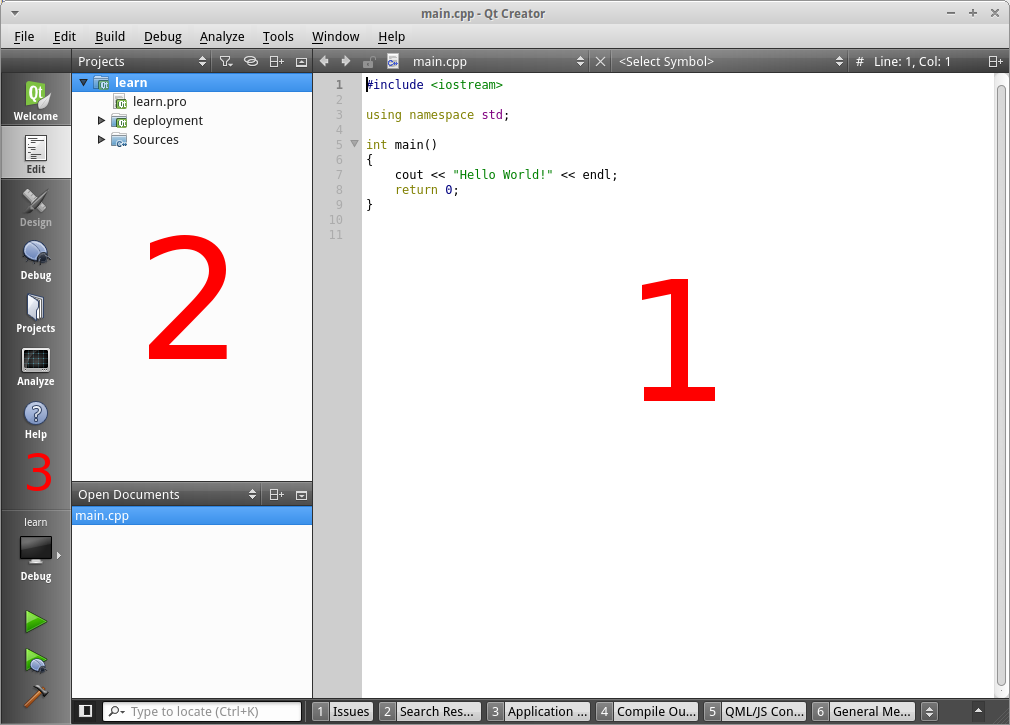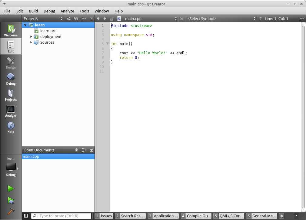 Ensuite Qt Creator vous demandera un nom de projet, mettez par exemple learn pour cet apprentissage. Cliquez sur suivant à plusieurs reprises, puis le tant attendu éditeur apparaît enfin !